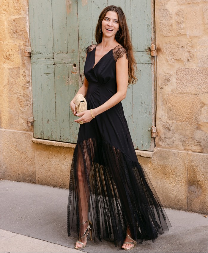 La robe VELA est une robe de soirée au style épuré et féminin, pensée pour sublimer la silhouette avec élégance. Son décolleté dos V met en valeur le buste, tandis que son dos plongeant en dentelle apporte une touche délicate et sensuelle. Le corps est réalisé dans un crêpe doux, fi…