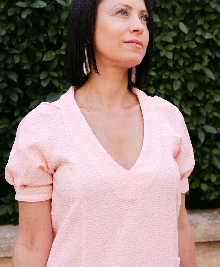 tandis que les manches légèrement bouffantes apportent une touche féminine