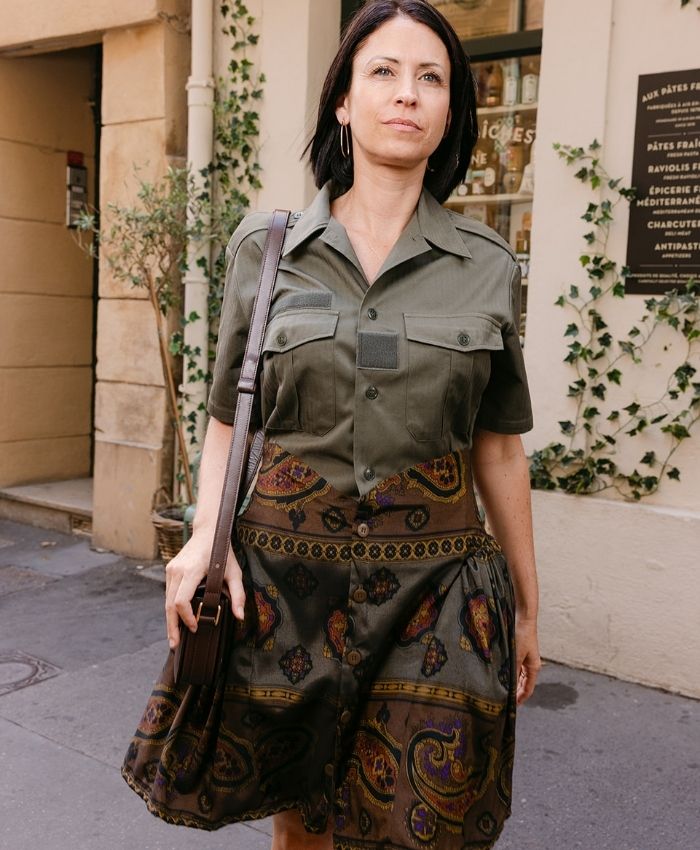 Issue de la collection " Les Upcyclées", la Robe Vintage Upcyclée U.180 associe la force du style militaire à la grâce provençale. Confectionnée à partir d'une véritable chemise militaire et d'une jupe à motifs verts, elle allie structure, modernité et douceur satinée.